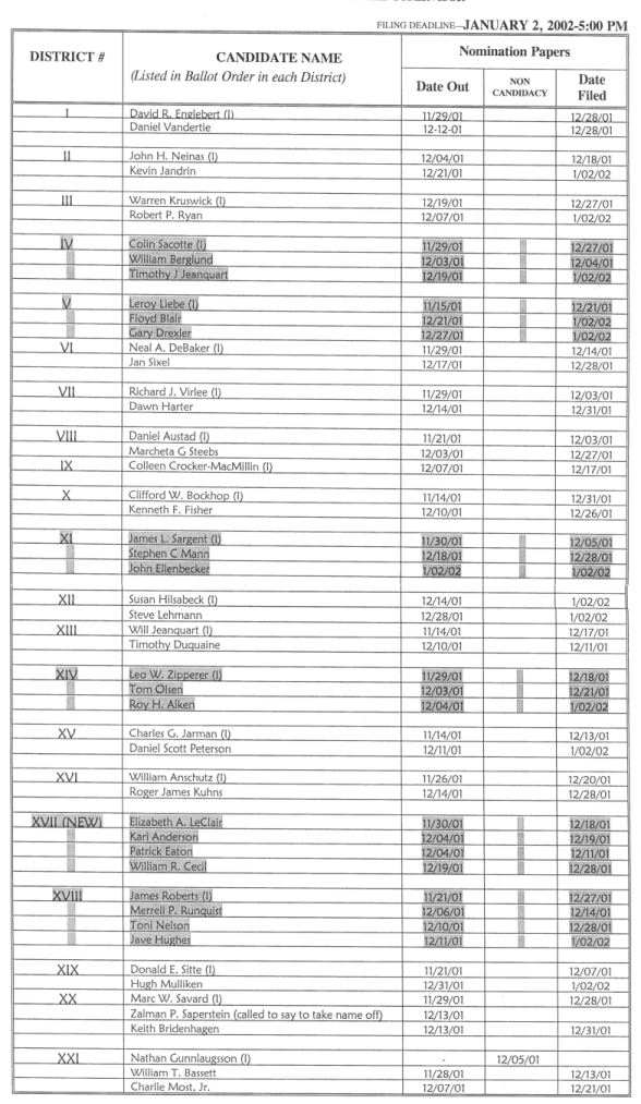 *=incumbent (after recall), $="former" incumbent, before Feb 19 recallDistrict Candidate Result 1 Englebert * WON   Vandertie Lost 2 Neinas * WON   Jandrin Lost 3 Ryan * WON   Kruswick $ Lost 4 Sacotte * WON   Berglund Lost 5 Liebe * WON   Blair Lost 6 Sixel * WON   DeBaker $ Lost 7 Harter * Lost   Virlee $ WON 8 Steebs * Lost   Austad $ WON 9 Crocker-MacMillin * WON   McIntosh (126 write-ins) Lost 10 Fisher * WON   Bockhop $ Lost 11 Ellenbecker * Lost   Sargent $ WON 12 Lehmann * Lost   Hilsabeck $ WON 13 Duquaine * WON   Jeanquart $ Lost 14 Aiken * Lost   Olsen WON 15 Jarman $ WON   Peterson Lost 16 Kuhns * WON   Anschutz $ Lost 17 Cecil * Lost   Anderson WON 18 Nelson * Lost   Runquist WON 19 Sitte *$ Lost   Mulliken WON 20 Bridenhagen * WON   Savard $ Lost 21 Bassett *$ Lost   Most WON The COG recall post-election party was held at the Nautical Inn: