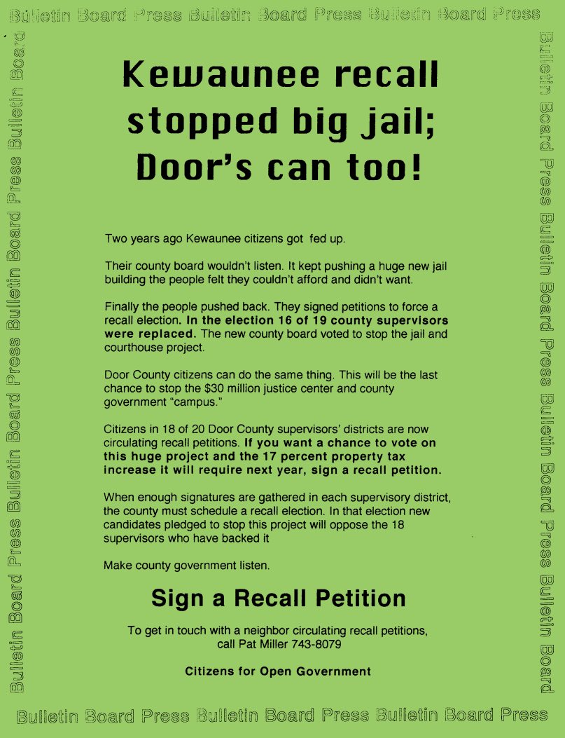 18 of the 20 County Supervisors voted to build the Justice Center. We need to to recall all EXCEPT these who have consistently voted against the project:List of Door County Supervisors by District