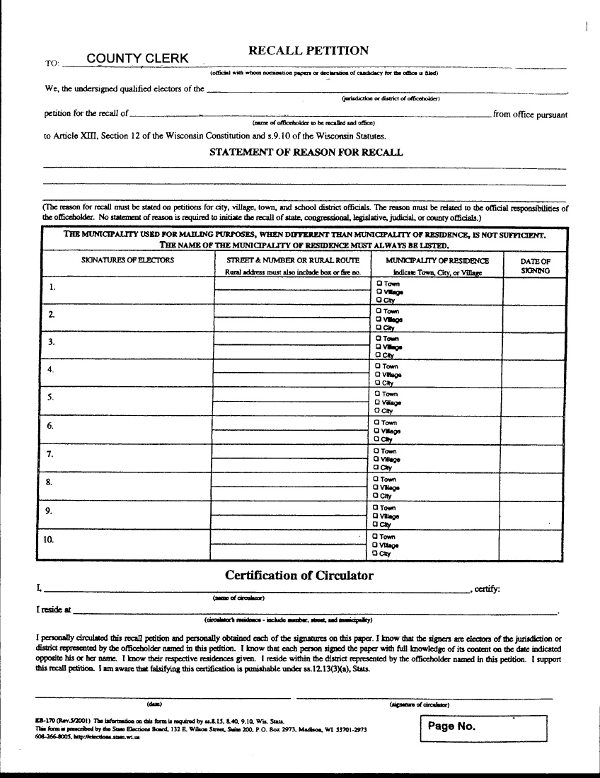 - Alternate version: Official Wisconsin State Recall Petition in Acrobat PDF format