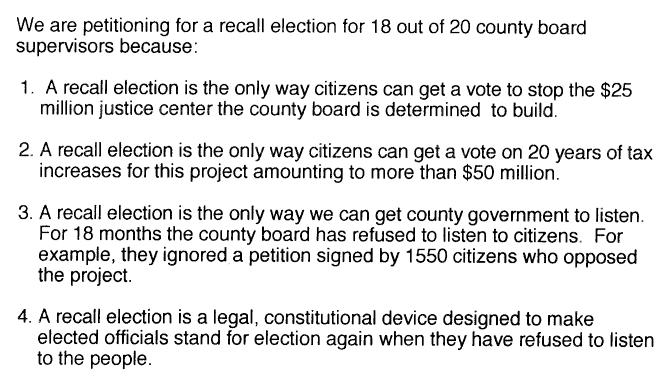COG feels this action should be stopped. A petition signed by 1550 residents was ignored by the County Board. A recall of the supervisors that voted for the Justice Center project may be the only way to stop it.